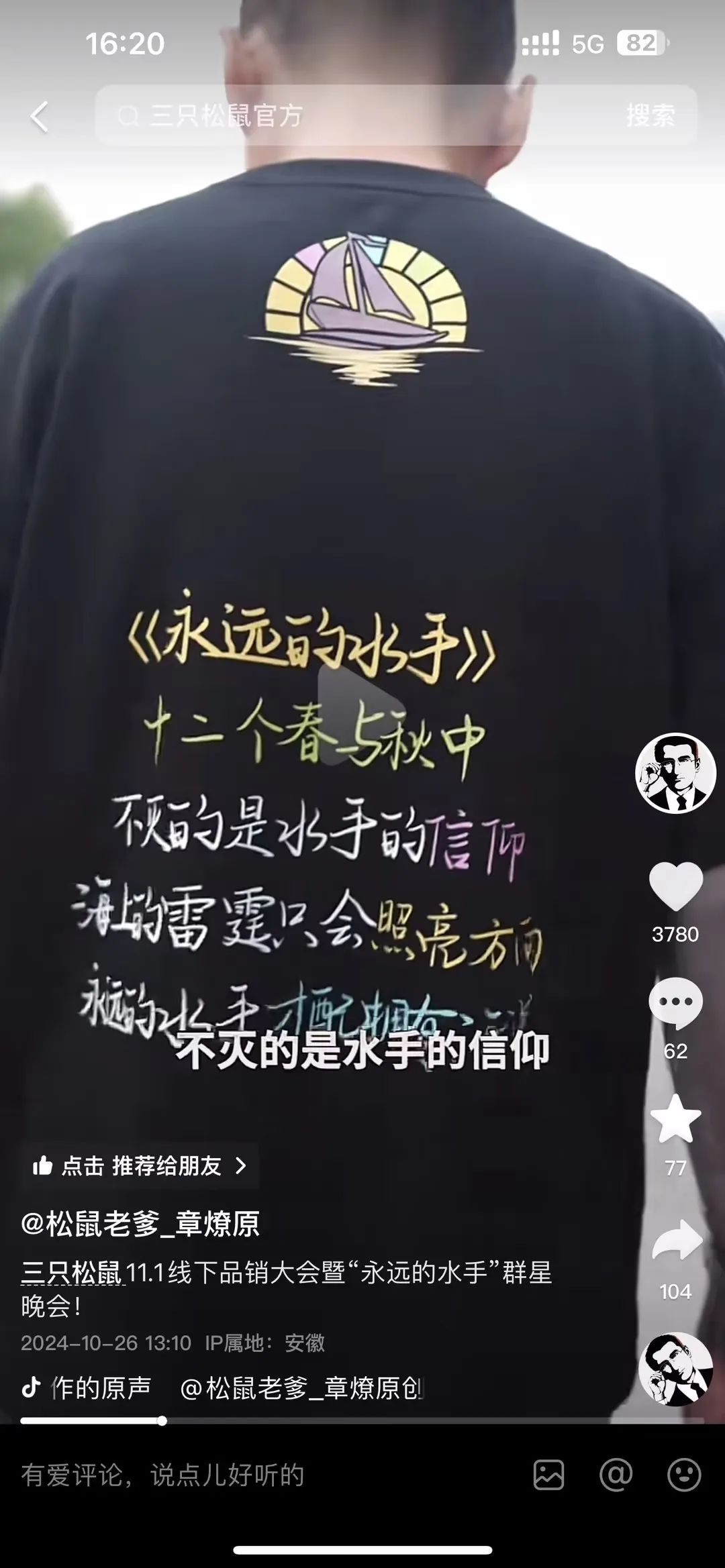 相比之下,章燎原的表态更为低调,他并未正面发布直接的言论。不过,从其为线下品销大会暨永远的水手主题晚会准备的“战袍”,或许可一窥三只松鼠的野心。