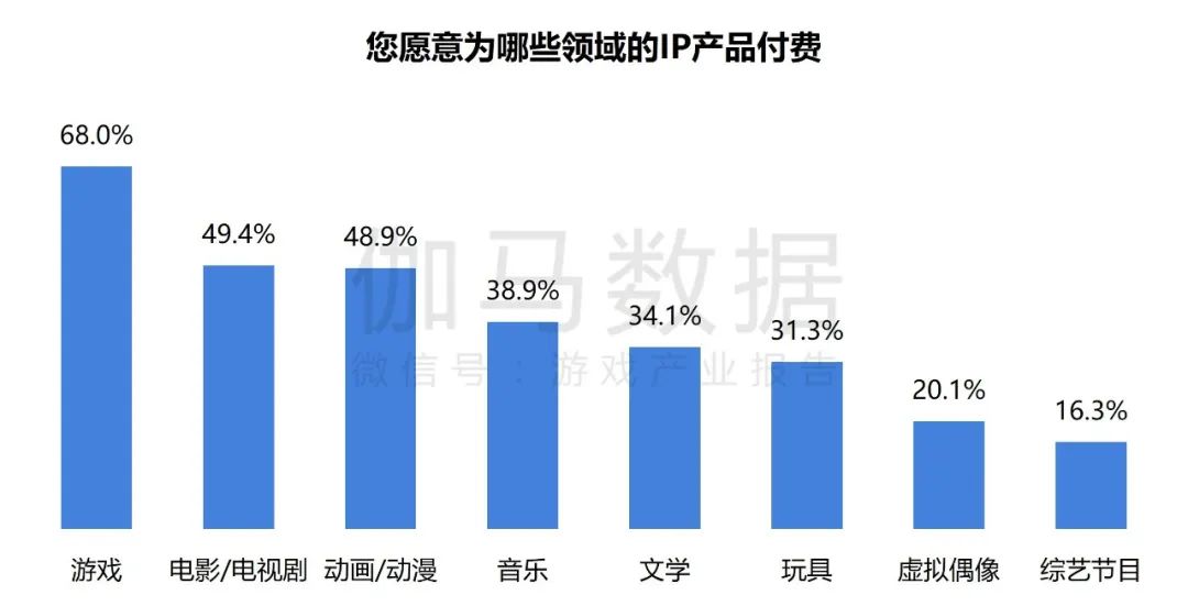 而用户侧的调研也显示,在各类IP布局领域中用户最愿意为游戏付费。整体而言,各领域的变现状况存在差异,游戏仍是IP价值变现的重要布局领域。