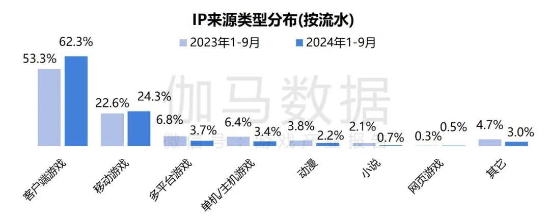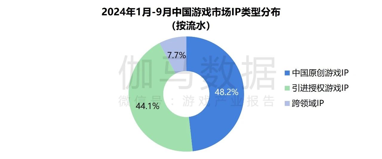 从细分的IP数据来看,2024年前三季度中国原创游戏IP的流水占整体市场规模近5成,在各类IP中占比最高。