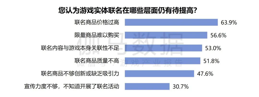 从有待改进的方面来看,“价格”是用户关注的重点:超6成用户认为联名商品价格过高。虽然联名商品的专属设计、推广等相关费用增加了联名产品的成本,但企业仍需关注“用户对价格愈发敏感”的趋势,并根据IP调性谨慎选择应对策略。