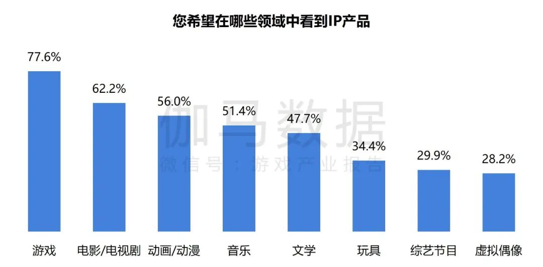 且在以游戏、电影/电视剧、动画/动漫、音乐为代表的领域中,超50%的用户有看到IP产品的意愿,具备着较强的IP偏好。