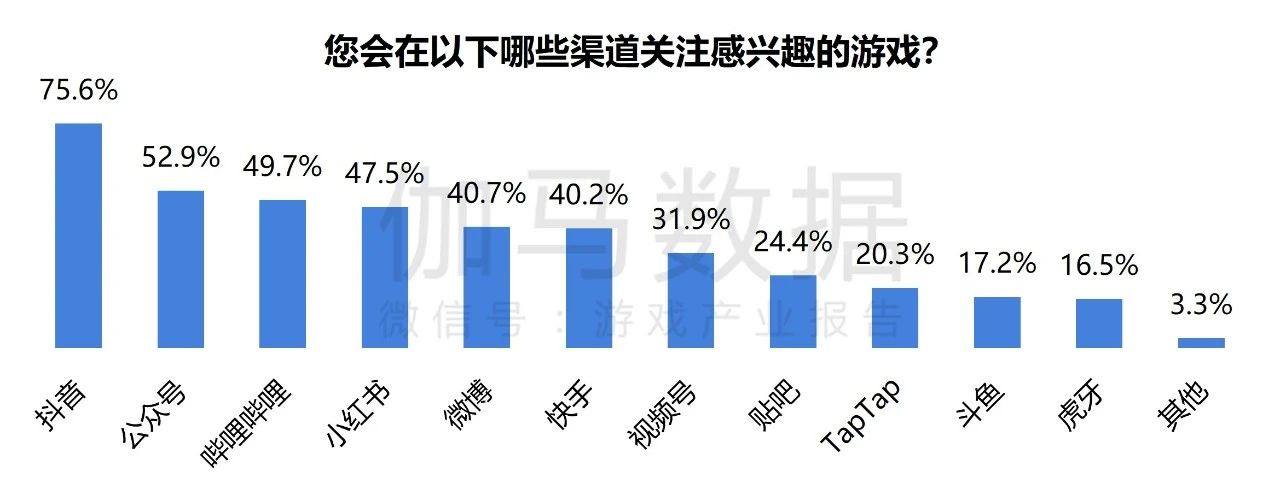 半数以上头部产品布局7个及以上运营渠道,75.6%用户通过抖音平台关注游戏