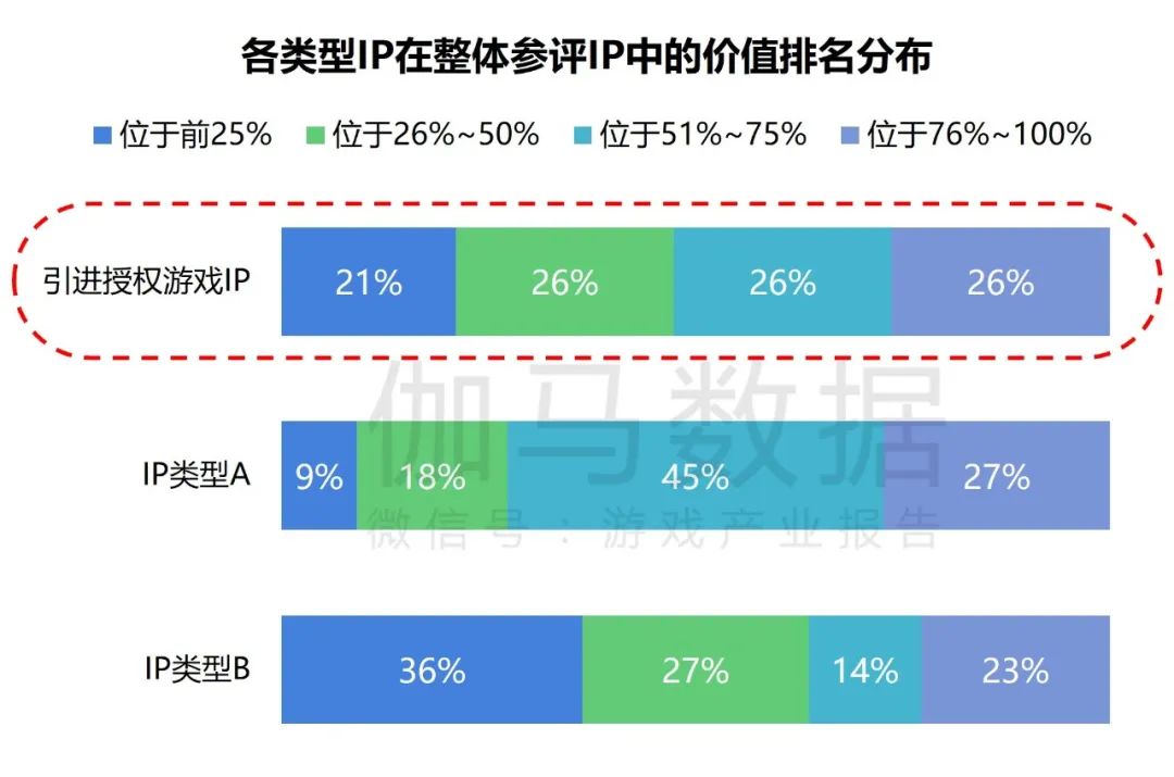 个体差异较大在于,虽然有21%的引进授权游戏IP位居整体参评IP的前25%,但排名在76%之后的IP数量占比也达到26%,高得分IP游戏与低得分IP游戏同样较多,IP间的差异较大。