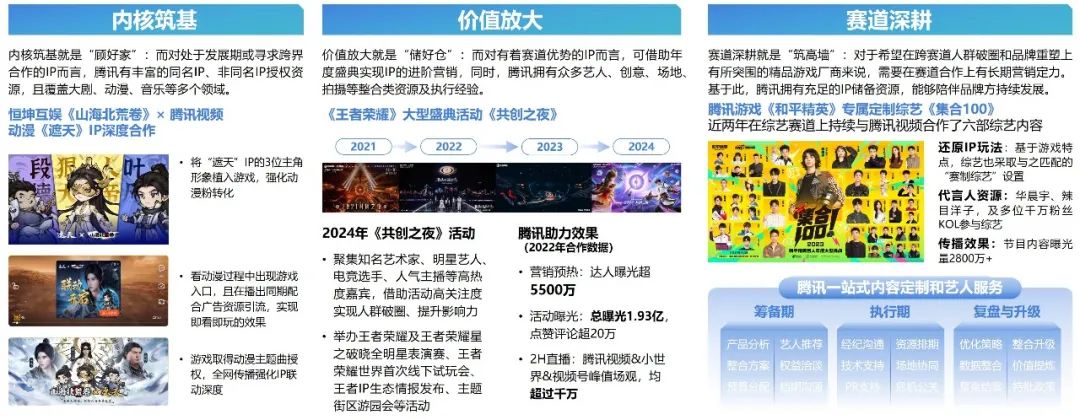 在此基础上,高质量的合作伙伴还有望提供其他助力,例如对个体企业而言属于新探索、新尝试的IP运营形式,或许合作伙伴已有较多经验及方法论,如果企业能将这部分经验应用于自身IP之上,则有望获取事半功倍的IP运营效果。而在众多拥有运营形式资源的企业中,腾讯广告旗下资源的丰富程度及方法论沉淀均属于产业前列,企业或可重点关注。