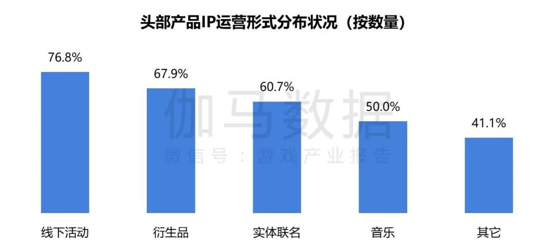 如上所述,更多用户关注游戏之外的IP价值提升,而在多元化的提升形式中,本次报告重点研究“线下活动”“实体联名”“衍生品”“音乐” 4种形式,上述运营形式正逐渐趋于常态化,头部产品中均有50%及以上布局。