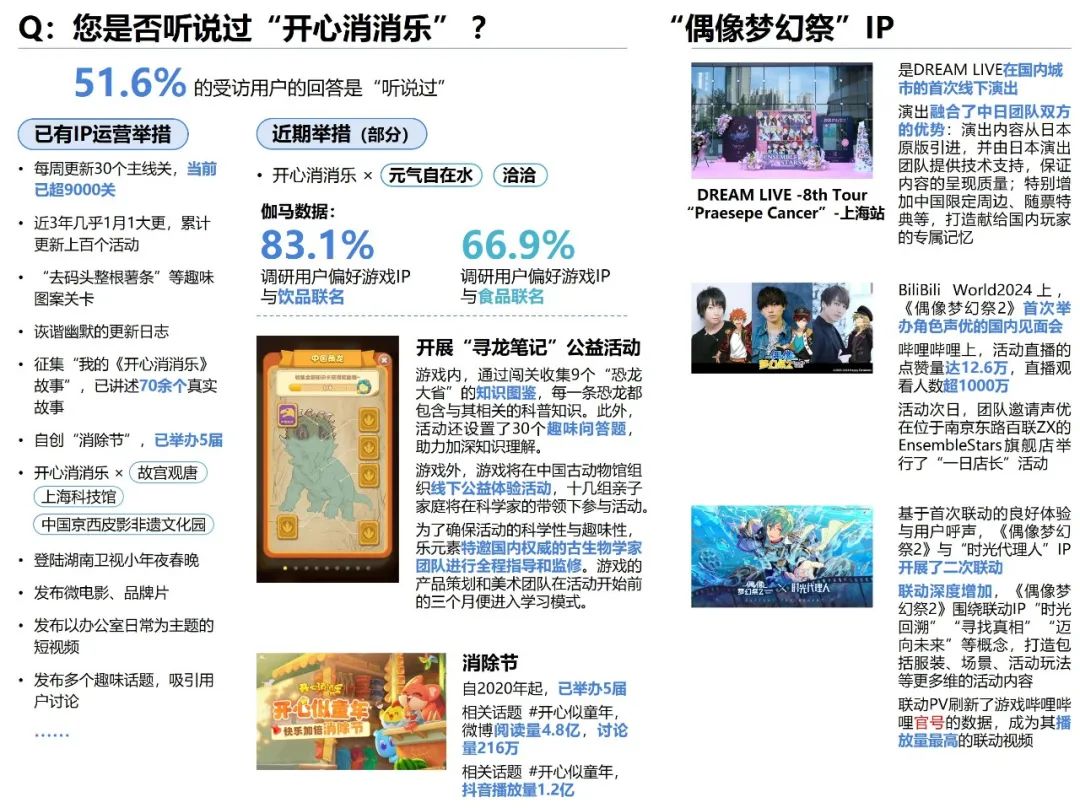 乐元素拥有“开心消消乐”“偶像梦幻祭”两个重点IP,并在持续运营下均取得了较显著的IP成果:51.6%的受访用户听说过“开心消消乐”;“偶像梦幻祭”下载量超1800万。