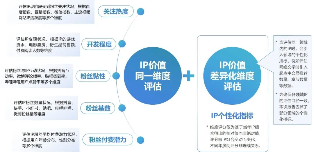 伽马数据的IP价值评估模型通常由“IP价值同一维度评估”“IP价值差异化维度评估”2部分组成,但为确保各领域IP的评估口径一致,本次估值仅保留了各领域IP共通的评估指标,而未包含部分领域个性化指标。