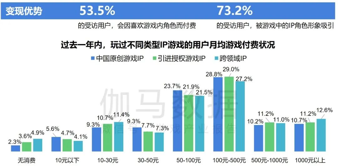另一方面,调查结果显示超50%的用户会为“角色”付费,而“角色”正是IP改编游戏最突出的特色之一,因而更容易实现变现。