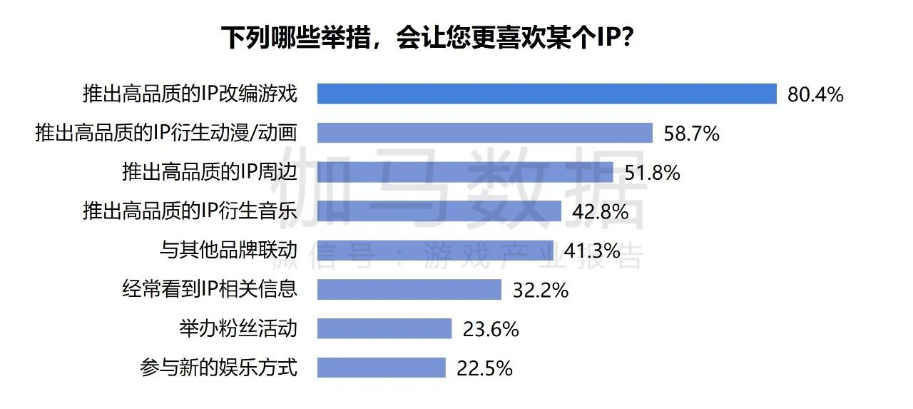 “版权方、被授权方合力运营IP”的布局方式也愈发重要,并有望取得商业回报、品牌价值的双重提升,从用户调研来看,80.4%的用户也认可高品质游戏对IP口碑的提升作用。上述效果与此类合作的典型特征有关,版权方与被授权方基于IP达成深度合作后,版权方通过开放长周期授权、独家授权、允许推出多款游戏、减少对推出游戏的限制等权限,给予被授权方更大的创作自由。而在更大的自由之下,被授权方能以更全盘的视角制订IP游戏的推出计划;同时由于收益与IP价值深度绑定,被授权方更愿意主动地维护、服务取得的IP。因此,通过版权方、被授权方合力运营IP,IP更容易取得商业回报、品牌价值的双重提升。而随着合作价值被更广泛地认知,企业间的合作范围也将拓展,动漫/动画、衍生品、音乐等领域均有望成为IP合作的切入点,并最终形成由多家企业合力扩大IP“蛋糕”的多赢局面。