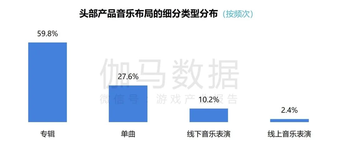 头部产品的数据显示,75%的产品布局了音乐单曲,线下音乐表演、专辑、线上音乐表演3种形态也分别有35.7%、21.4%、10.7%的产品布局。