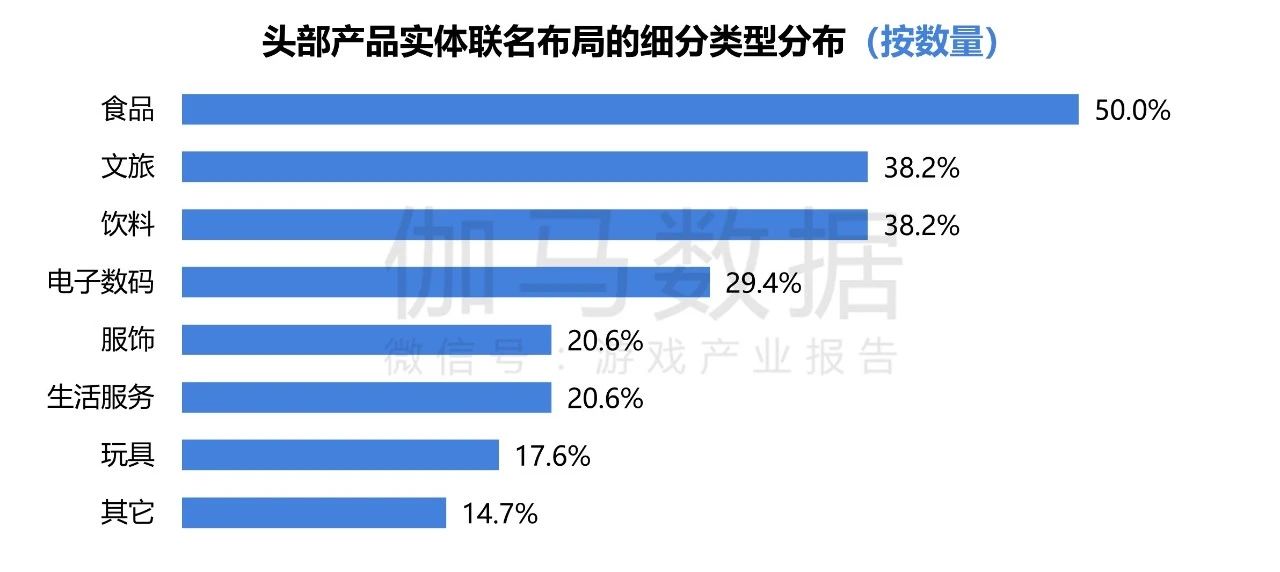 近年来,通过IP授权合作进行跨行业实体联名的运营形式逐步兴起,产品种类覆盖范围广、实用性强是联名商品的主要特点,并且联名商品在保持其原有功能属性的基础上亦可融入日常、满足用户的情绪价值,受益于以上特点,实体联名商品往往能渗透至玩家生活中的多个领域。从联名对象来看,传统行业是较多企业首选,以餐饮行业为例,食品有50%企业选择,此外,一些产业如住宿、出行等领域也正与游戏产业融合发展。