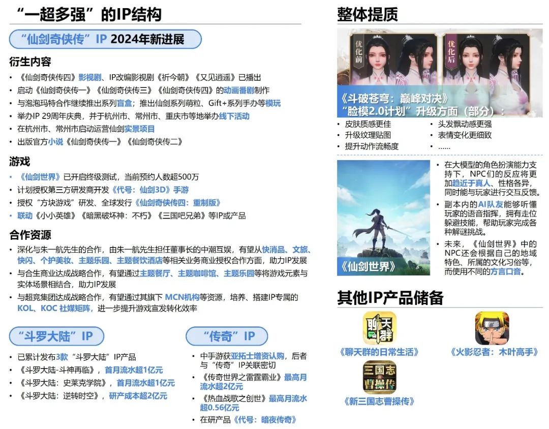 高频开展IP活动主要体现为,2024年企业旗下“永恒之塔”“血族”“冒险岛”等多个IP开展活动,涉及衍生品、实体联名、线下活动等形式。强化IP产品品质上,2024年“传奇”IP上线“新百区”,助推《热血传奇》系列端游活跃用户一度同比增长81.6%、收入也同比增长108.1%;“龙之谷”IP也取得了怀旧服首周收入同比增长88%、《龙之谷世界》测试留存近80%的表现,一定程度代表用户认可其品质;注重IP维权上,企业持续打击衍生品等侵权行为,并通过参与行业版权活动等方式强化维权能力;整合IP上,“传奇”IP已获得中国大陆的完整独占权,且持续推进授权、发行、研发环节的整合,并强化与产业链头部企业的合作。