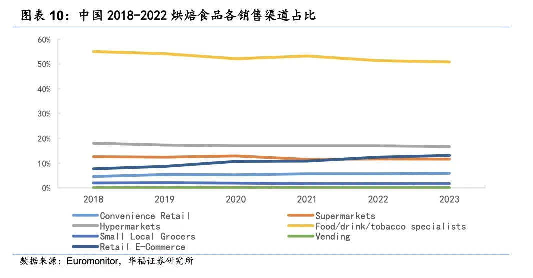 近年来我国烘焙门店在烘焙食品渠道的占比下降。根据欧睿国际数据,中国烘焙食品在Food/drink/tabacco specialists(食品/饮料/烟草专卖店)这一零售渠道的销售额占比,从2018年的55%下降至2022年的51.3%。[3]