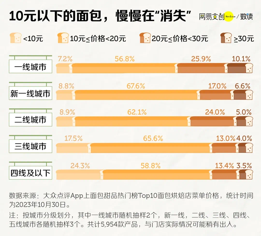 消费者对于烘焙价格也有高敏感度。目前,在社交媒体上,消费者对线下烘焙门店图吐槽最多的问题就是“贵”。网易数读曾做过这样一个统计:10元以下的面包,慢慢在“消失”。