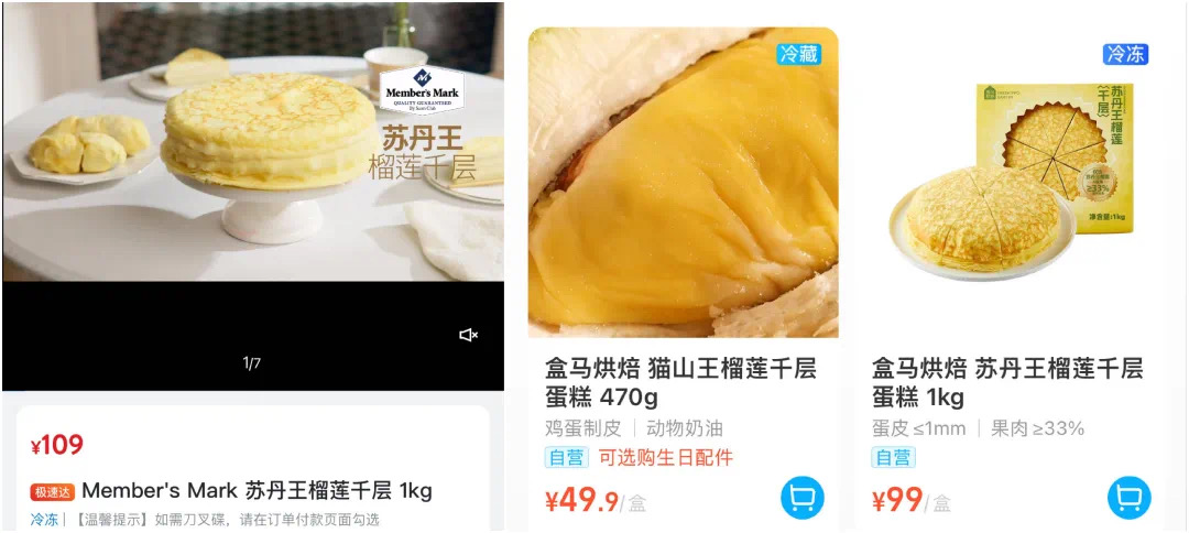 如今,盒马平台还保留两款榴莲千层蛋糕,分别是猫山王榴莲千层(470g)价格为49.9元,苏丹王榴莲千层蛋糕(1kg)价格为99元。山姆产品则更新为苏丹王榴莲千层(1kg),价格为109元。