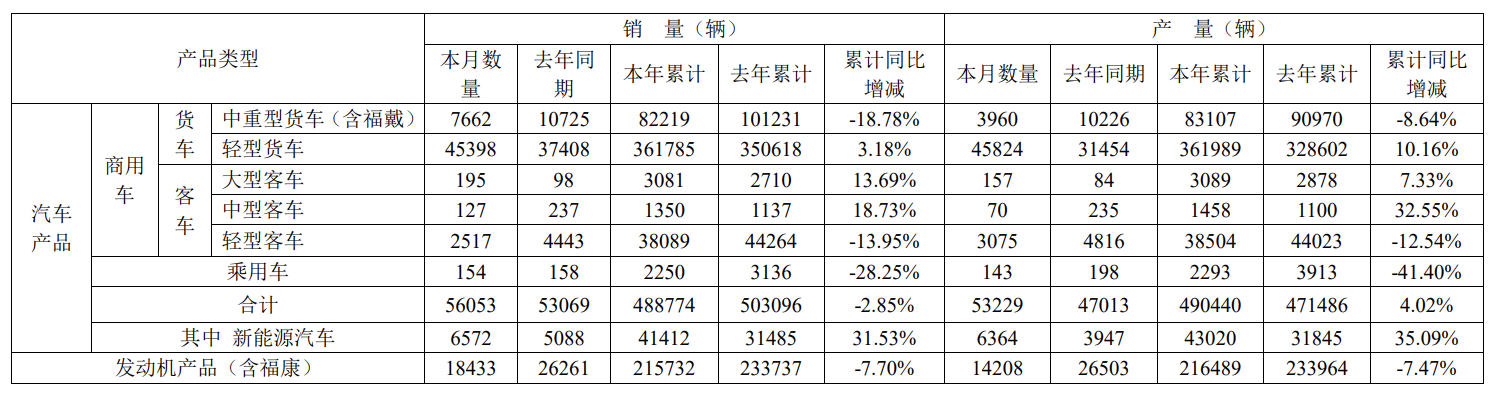 福田汽车:前10月汽车产品累计销量48.88万辆,同比下降2.85%