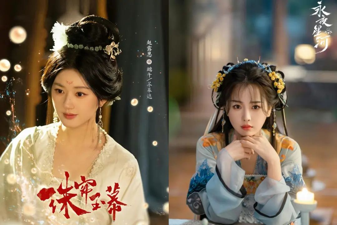 分别在腾讯视频和优酷独播的《永夜星河》《珠帘玉幕》在同一天的同一时间上线,同为古装言情,女主角是同属95花第一梯队的虞书欣和赵露思,甚至,两部剧的男女主都是「CP二搭」。多重共性叠加下,两部新剧尚未上线,便已经在大众舆论场中被视作一次平台与主演共同的正面对线。