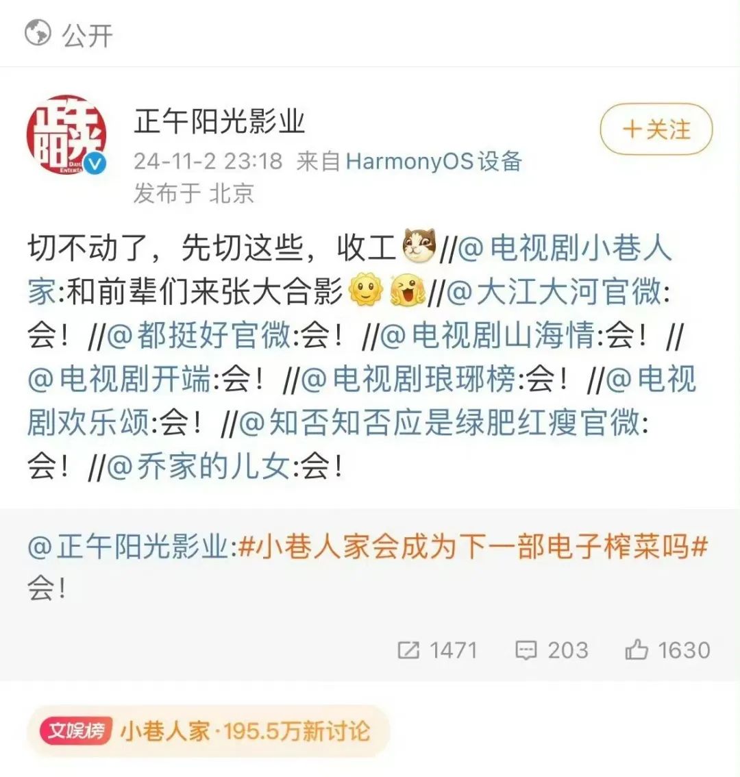 另外,冷清了小半年的剧集市场,也的确需要足够新鲜和有参与感的话题。前几天摇人事件沸沸扬扬的时候,就连隔壁现代剧《小巷人家》也加入其中,用正午阳光出品的其他剧集官博转发宣传,创造了另类的摇人场面。