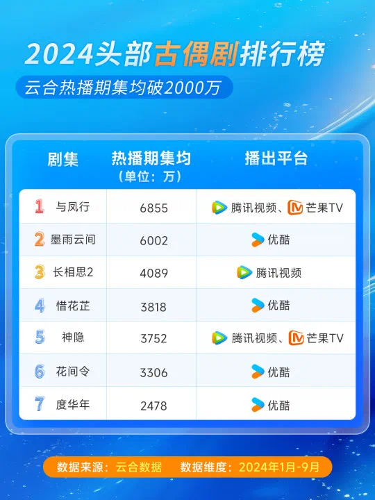 去年以来,优酷的内容投入明显加大,特别在古装、悬疑等垂直品类交出了不错的成绩单。云合数据显示,今年截至Q3集均破2000万播放的七部古装剧中,有四部都来自优酷,包括《墨雨云间》《惜花芷》《花间令》和《度华年》。连续多部头部作品下,优酷提出并试图强化「古装第一厂牌」在用户中的认知。