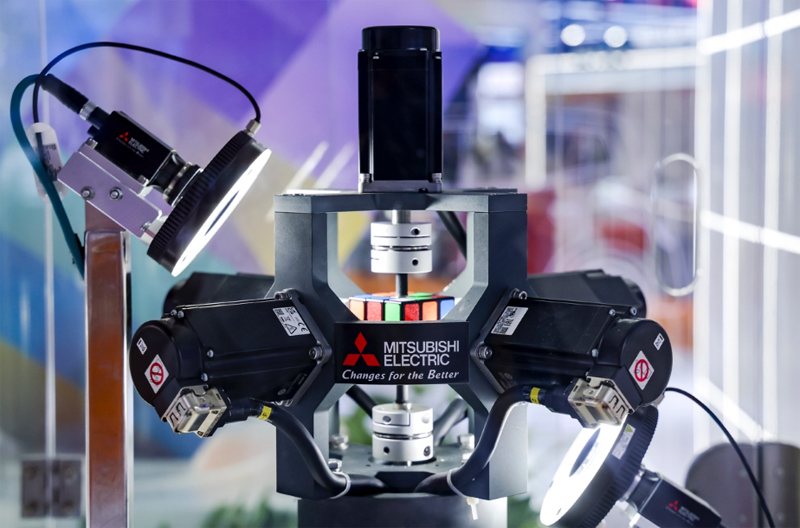 仅用0.305秒就还原了魔方!在另一位进博“全勤生”三菱电机的展台,三阶魔方还原的世界纪录保持者TOKUFASTbot吸引了众多观众驻足。据介绍,该机器人使用了三菱电机的高速高精度定位技术、AI色彩识别算法等尖端技术。