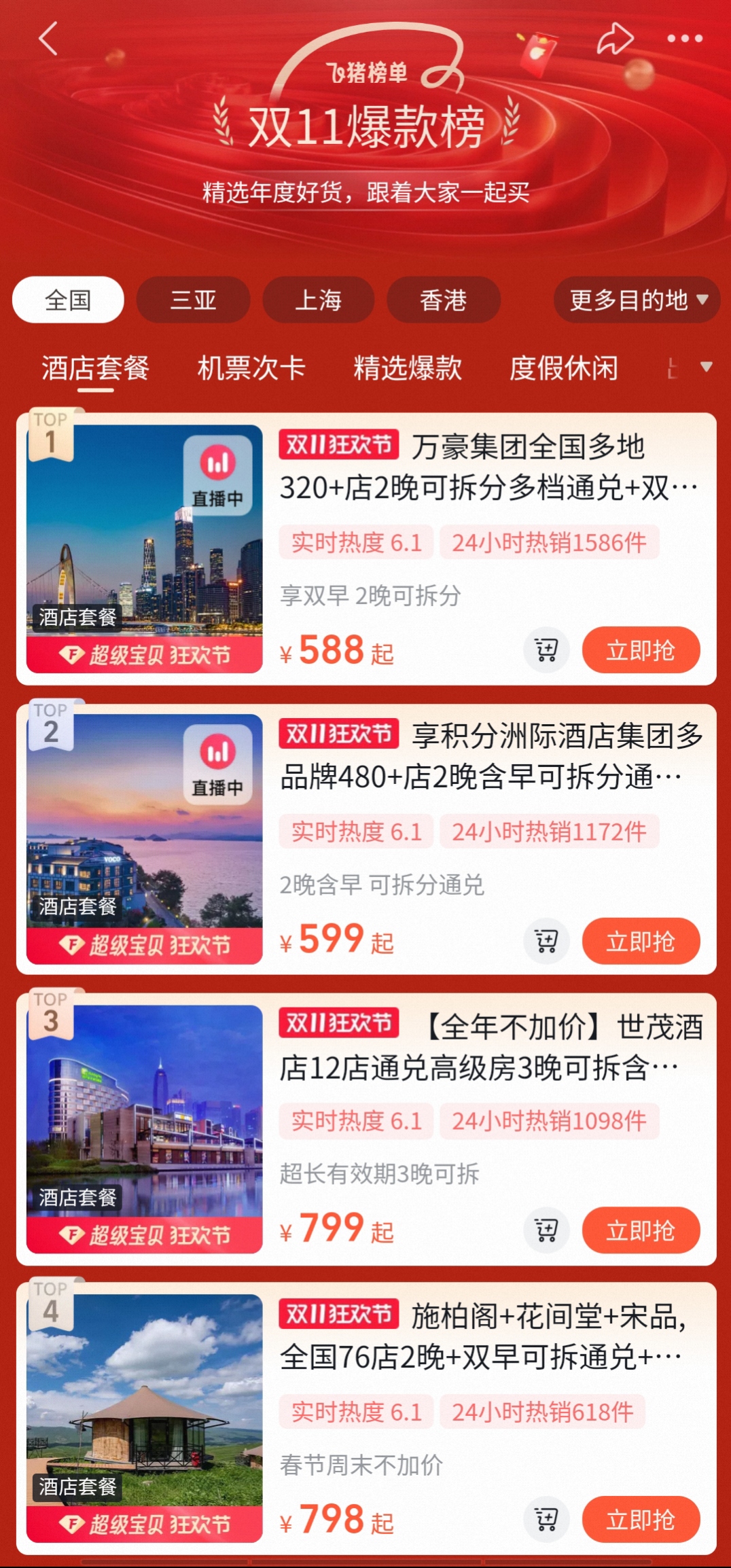 4折的香港顶奢酒店文华东方,原价随便1晚都要4700+,现在2晚卖4599元,还带行政酒廊;2799元4晚的三亚海棠湾君悦;1099元3晚的海南富力凯悦;今年飞猪的双11闪促,可以说是一堆“史低价”。