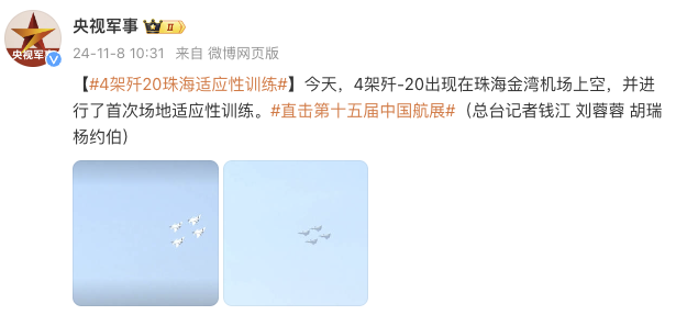 今天,4架歼-20出现在珠海金湾机场上空,并进行了首次场地适应性训练。(央视军事)