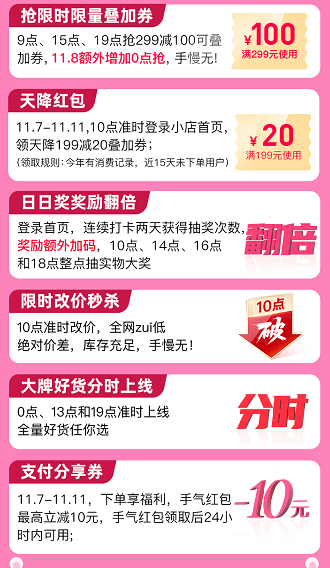 梦饷科技本次双11活动特别为消费者设置了抢限时限量叠加券、天降红包、日日奖奖励翻倍、限时秒杀、大牌好货分时上线、支付分享券六重玩法。尤其是梦饷科技在11月重磅推出的日日奖活动,消费者只需登录饷店首页连续打卡两天,即可获得抽奖次数,双11活动期间奖励额外加码,在10点、14点、16点和19点,还有机会抽取实物大奖,提升购物乐趣。