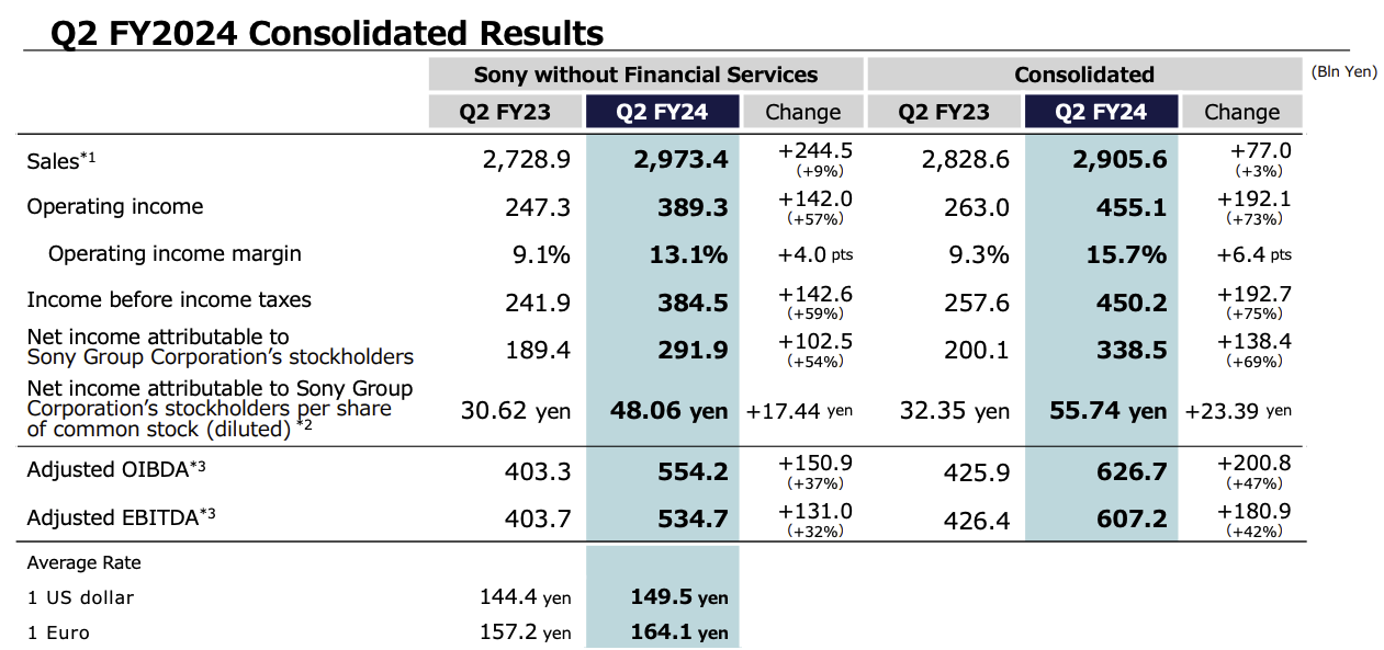 11月8日,索尼集团发布2024财年第二季度财报。第二财季营收为2.9056万亿日元,同比增长3%;营业利润为4551亿日元,同比增长73%;净利润达3385亿日元,同比增长69%。