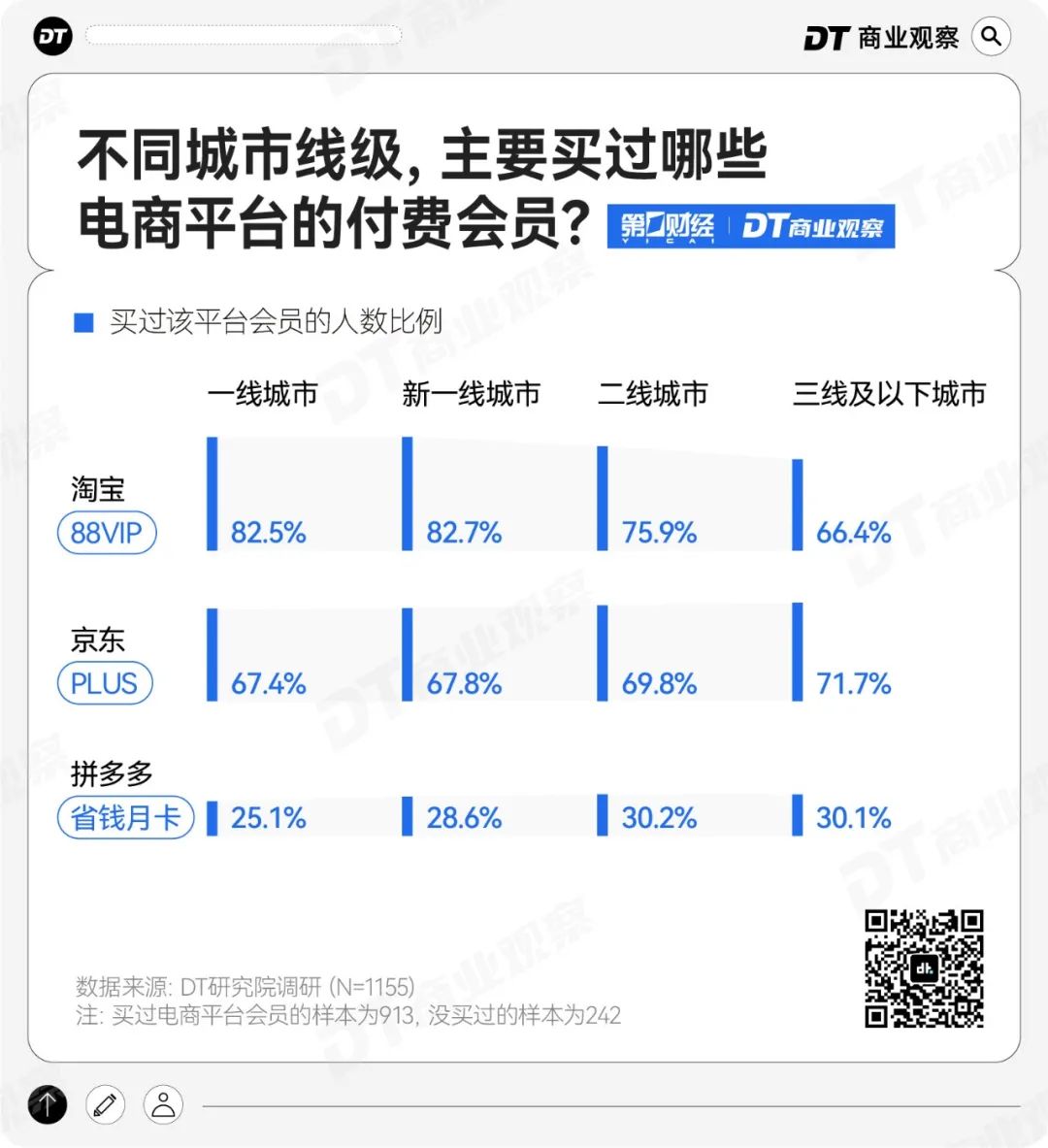 尤其是京东。三线及以下城市人群中买过京东PLUS会员的比例,甚至超过了淘宝88VIP。