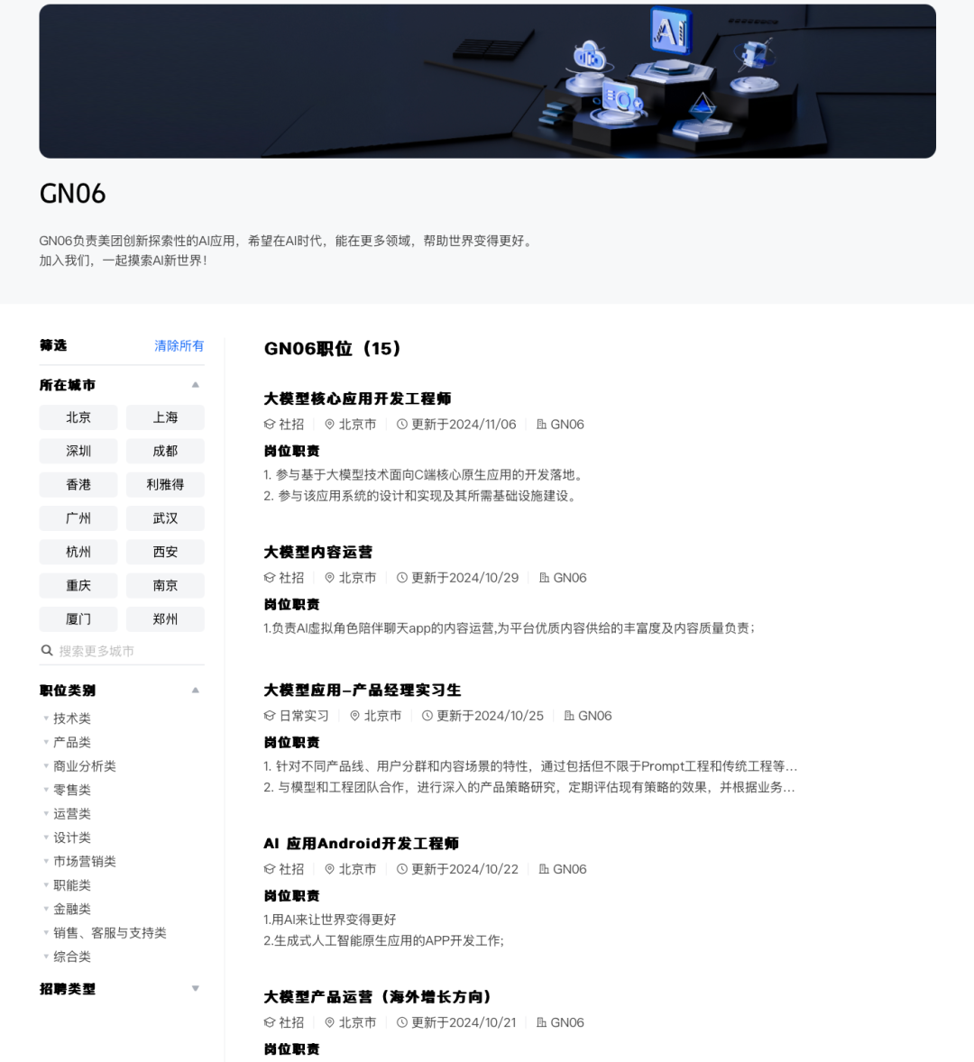 美团·招聘显示,GN06负责美团创新探索性的AI应用,希望在AI时代,能在更多领域,帮助世界变得更好。“加入我们,一起摸索AI新世界!”