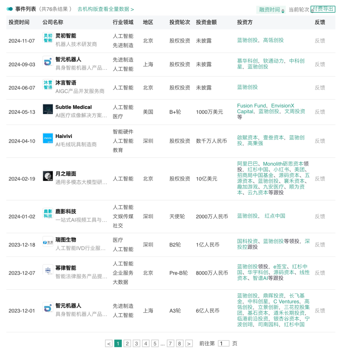 以蓝驰创投为例,除了继续押注月之暗面、智元机器人等明星项目外,今年以来,公开报道中,该机构已投资多个AI应用C端项目,包括一站式AI视频工具与内容平台鹿影科技、AI毛绒玩具制造商Haivivi、AIGC产品开发服务商沐言智语等。