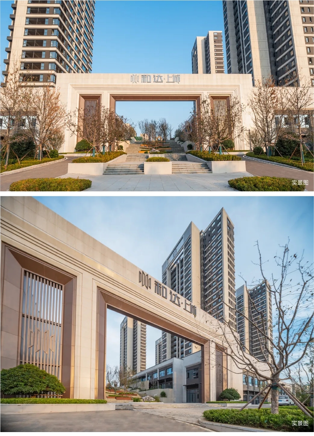 归家,是生活仪式感重要体现。和达·上城打造长约40m,高约15m超尺度阔境大门,天然石材与精致金属完美融合,如艺术画卷般徐徐展开,庄重典雅,恢宏大气,每一处细节都彰显大家风范。对称轴线迎宾大道,迎接业主每次归家。台地式景观园林,错落有致,一步一景,营造如诗如画归家礼序。