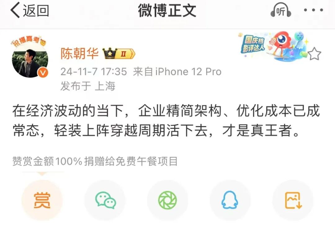 而哪吒汽车副总裁陈朝华则在当天下午发微博表示,“在经济波动的当下,企业精简架构、优化成本已成常态,轻装上阵穿越周期活下去,才是真王者。”似是对市场议论的回应。