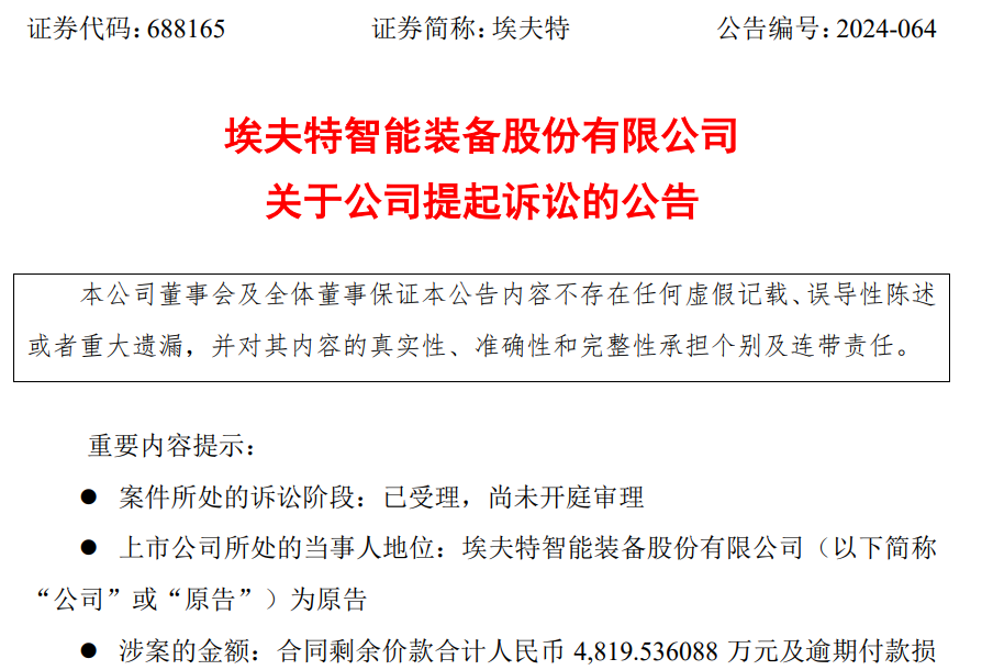 11月8日,埃夫特智能装备股份有限公司(688165.SH)(简称“埃夫特-U”)公告称,因合众新能源汽车股份有限公司宜春分公司(简称“宜春合众”)拖欠合同款约4819.54万元,埃夫特-U已经向法院起诉宜春合众,要求支付拖欠的合同款并赔偿逾期付款损失;同时起诉了宜春合众的母公司合众新能源汽车股份有限公司(简称“合众新能源”),要求对上述债务承担补充清偿责任。
