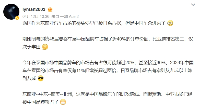 值得一提的是,今年去泰国考察的一位产业链人士表示,泰国的广告牌已经不够中国车企用了,马路两侧的广告牌几乎被比亚迪、名爵、长城等中国车企包圆。