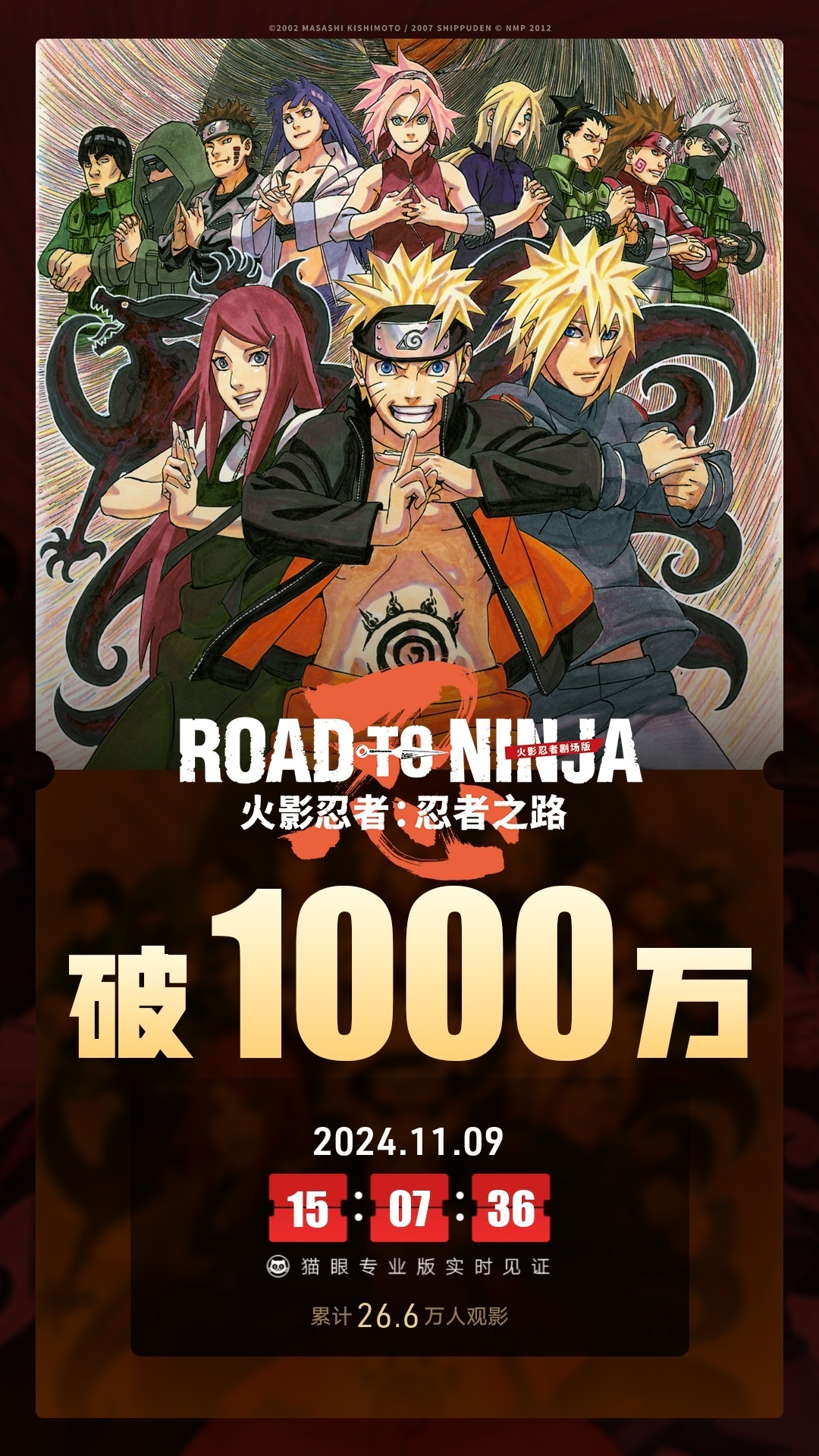 据猫眼专业版数据,电影《火影忍者剧场版:忍者之路》上映1天 ,总票房破1000万。