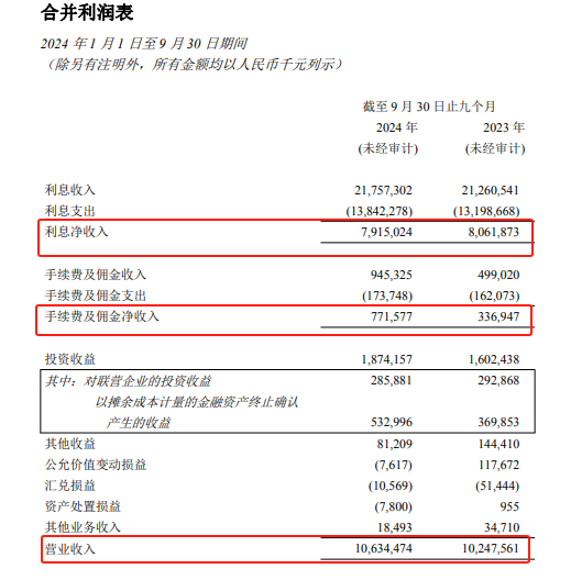2024年前三季度,重庆银行利息净收入实现79.15亿元,同比减少1.82%;手续费及佣金净收入7.72亿元,同比增长128.99%。投资收益18.74亿元,同比上涨16.98%。