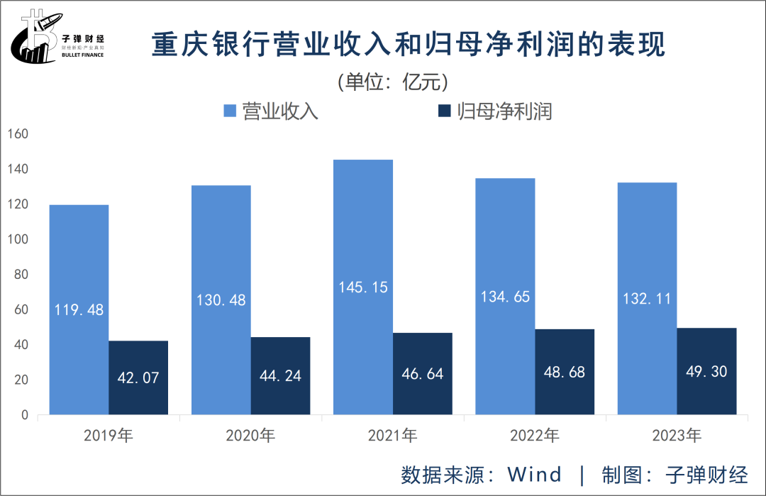 历年年报数据显示,2021至2023年,重庆银行归母净利润分别为46.64亿元、48.68亿元、49.3亿元;营业收入分别是145.15亿元、134.65亿元、132.11亿元。