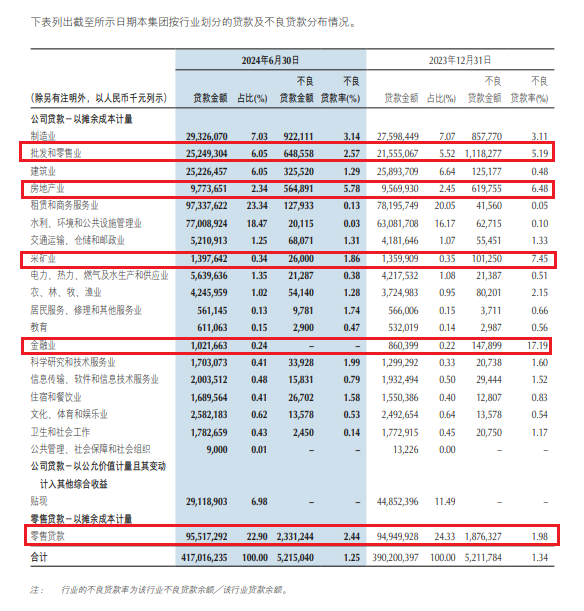 截至今年上半年,零售贷款不良贷款率2.44%,较上年末上升0.46个百分点;公司贷款不良贷款率0.99%,较上年末下降0.34个百分点。