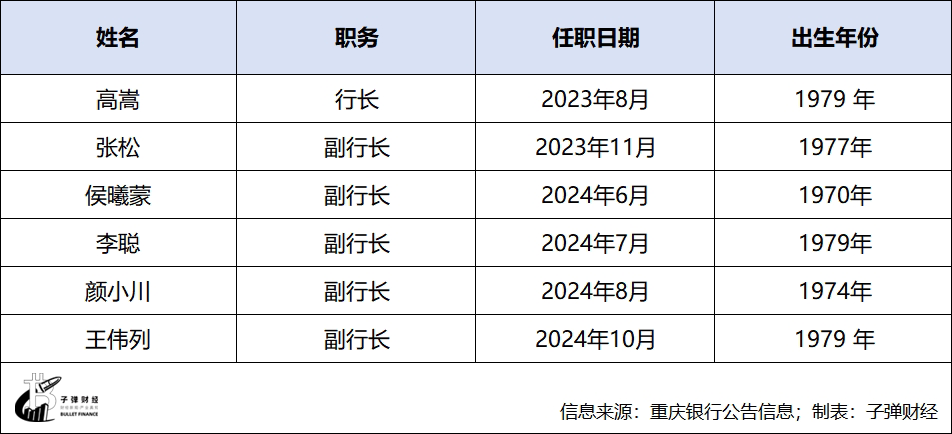 子弹财经注意到,自2023年以来,重庆银行曾发生多起人事变更。高层管理团队大调整,多位高管离任、“一、二把手”均有更替。