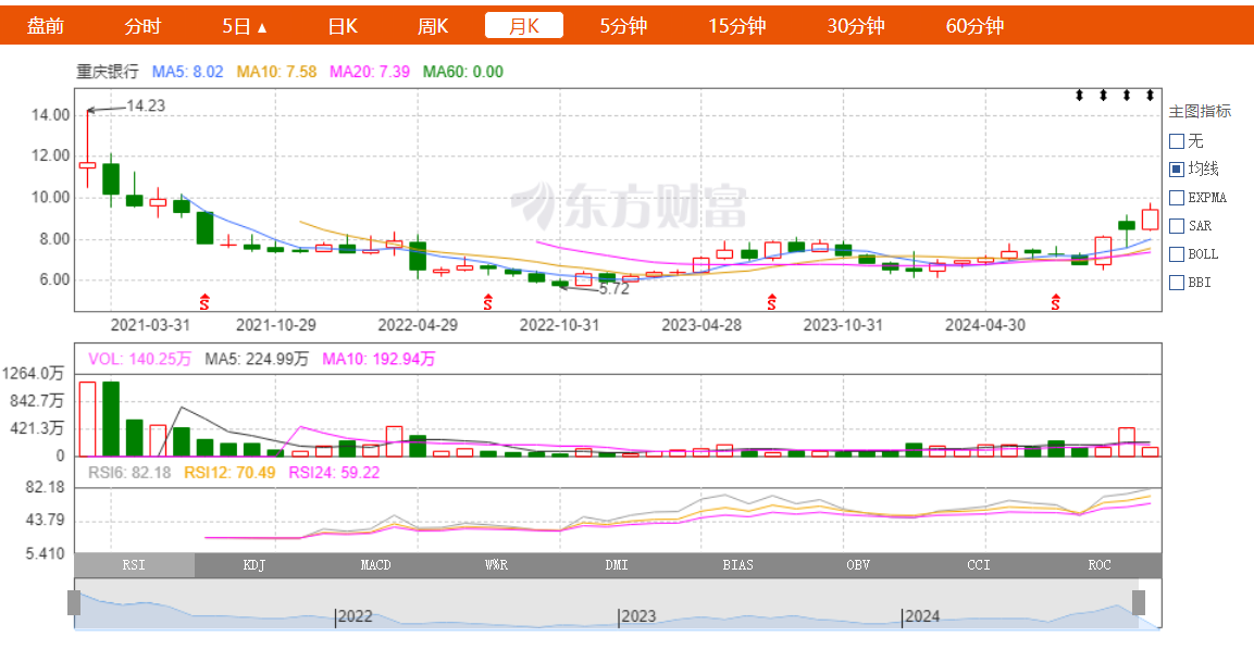 东方财富网显示,受大盘以及中报业绩双增等因素影响,自今年9月中旬重庆银行迎来一波上涨。截至11月8日,重庆银行收盘价9.45元/股,较该行历史最高点仍相差甚远。