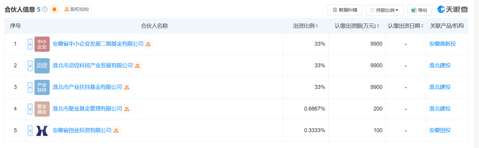合伙人信息显示,该基金由安徽省创业投资有限公司、安徽省中小企业发展二期基金有限公司、淮北市产业扶持基金有限公司等共同出资。