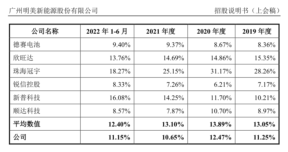 意向书中看到,明美新能2022年上半年的毛利率为11.15%,低于可比公司平均数值12.4%。界面新闻注意到,在后续的公告中,明美新能2022年的毛利率最后提升到了12.41%,公司解释主要受消费电子类产品、动力类和储能类产品毛利率上升所致。但遗憾的是,2023年上半年明美新能的综合毛利率跌至9.43%,公司解释主要因公司产品结构变化所致,低毛利率储能产品占主营业务收入的比例由30.07%增加到52.72%。