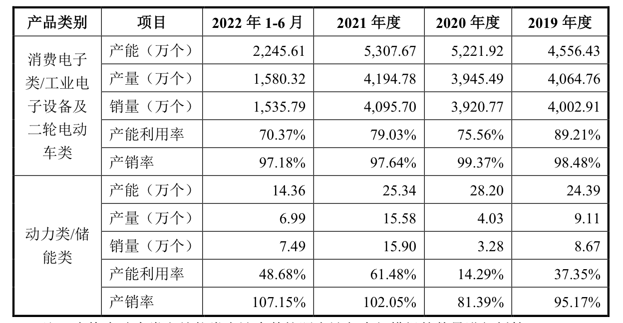 不过界面新闻注意到,明美新能“消费电子类/工业电子设备及二轮电动车类”的产能利用率有所下降,2019年至2022年上半年分别为89.21%、75.56%、79.03%、70.37%,“动力类/储能类”的产能利用率更低,2019年至2022年上半年为37.35%、14.29%、61.48%、48.68%。