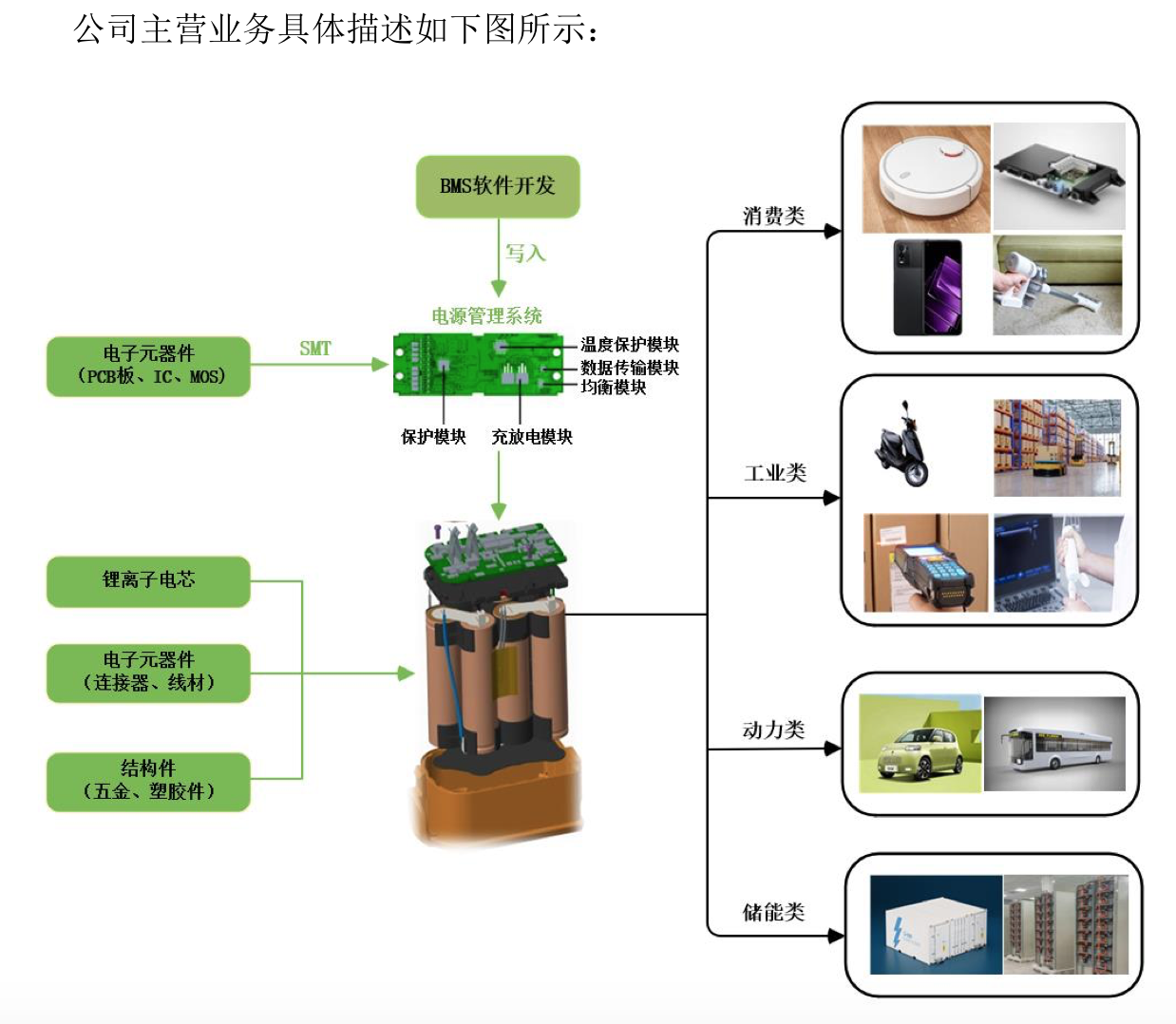明美新能专注于锂离子电池模组,公司锂离子电池模组主要应用于消费电子、工业电子设备、二轮电动车、动力和储能领域,与OPPO集团、斑马技术、纬创、伟创力、大陆集团、科沃斯、环鸿电子和远景科技集团等品牌建立了合作关系。