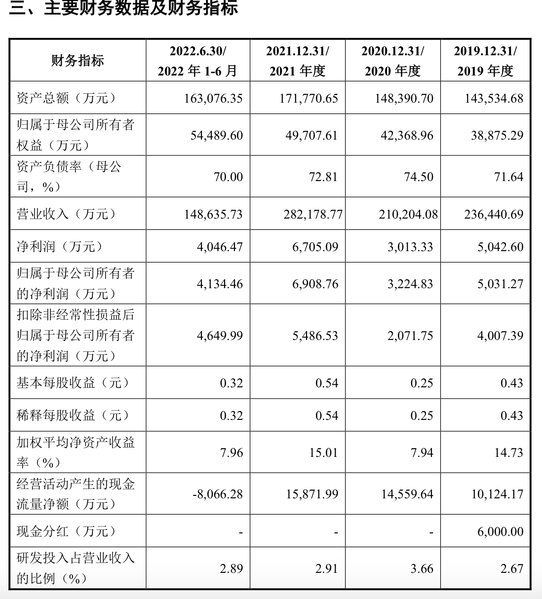 财务数据看,2022年上半年营业收入14.86亿元,净利润4134.46万元,2022年上半年经营活动产生的现金流量净额-8066.28万元,研发投入占比2.89%,公司在2019年有6000万元现金分红。
