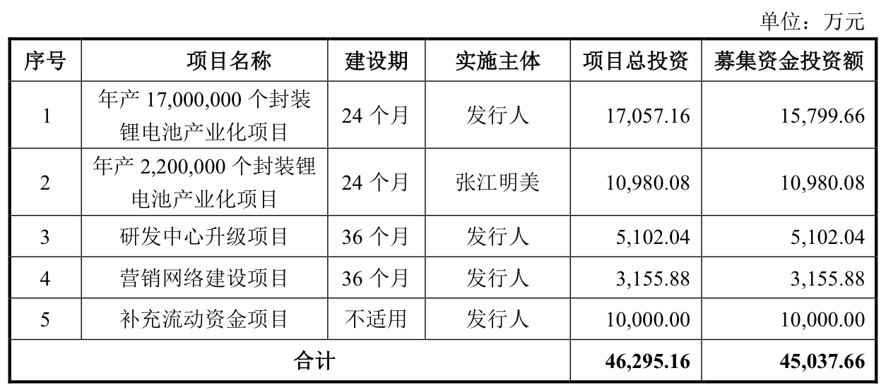 根据明美新能的规划,募资4.5亿元中,会投入“年产1700万个封装锂电池产业化项目”1.58亿元,“年产220万个封装锂电池产业化项目”1.1亿元,两者都是24个月建设期,也就是进行扩产。