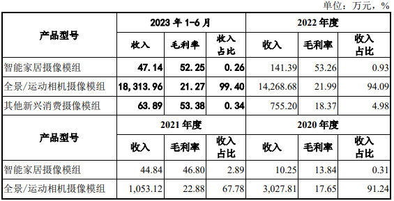 此外,因单价较低产品销售占比提高,弘景光电旗下智能家居光学镜头2022年以来平均销售单价呈逐年下降,每颗从16.6元、15.5元跌至2024年上半年的14.37元。鉴于同样的原因,该公司全景/运动相机光学镜头2021年以来的平均销售单价呈下降趋势,每颗从99.04元、93.38元、44.4元直线下滑至43.07元;公司的全景/运动相机摄像模组单价从2021年162.76元/颗涨至214.99元/颗,但该产品单价在2023年、2024年上半年因芯片、陀螺仪等原材料价格下降而下调至199.66元/颗、198.46元/颗。