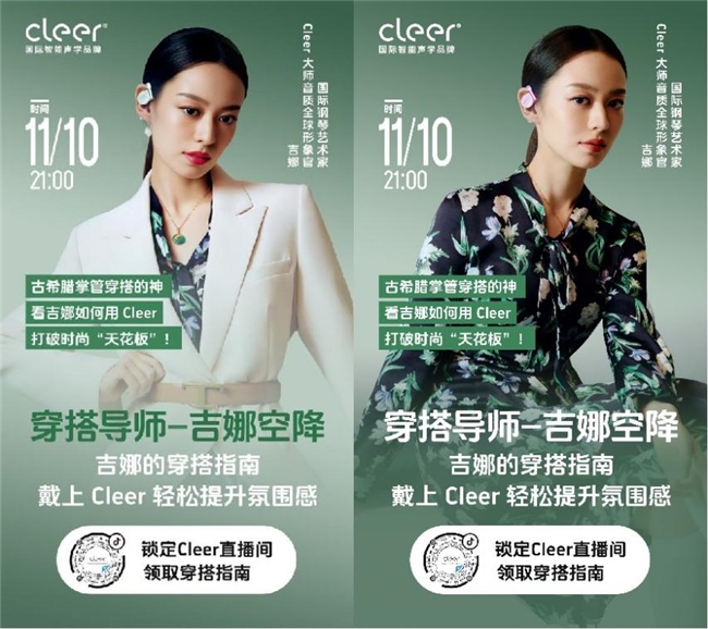不仅如此,作为“穿搭导师”的吉娜,11月10日晚9:00还将惊喜空降Cleer直播间,为深受“班味穿搭”困扰的打工人开展一堂独特的“吉娜穿搭小课堂”。不仅将在直播间现场翻包,分享她的时尚穿搭心得与爱用好物,还将通过现场变装这一环节,手把手教直播间观众如何提升穿搭氛围感,从而更好地“去班味”。