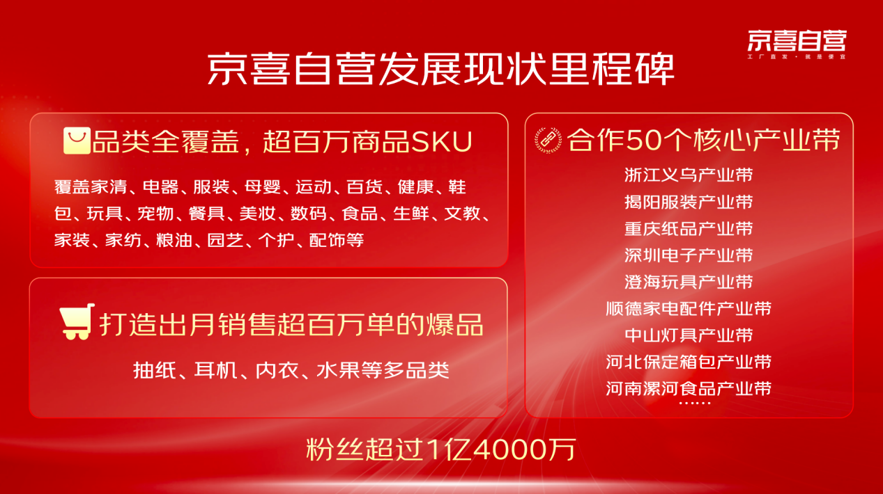 自2023年底上线以来,京喜自营目前已实现品类全覆盖,有超过百万的商品SKU,在抽纸、耳机、内衣、水果等众多品类上推出月销售超百万单的爆款商品。同时合作了包括浙江义乌、深圳电子、重庆纸品、澄海玩具等在内的50个核心产业带。